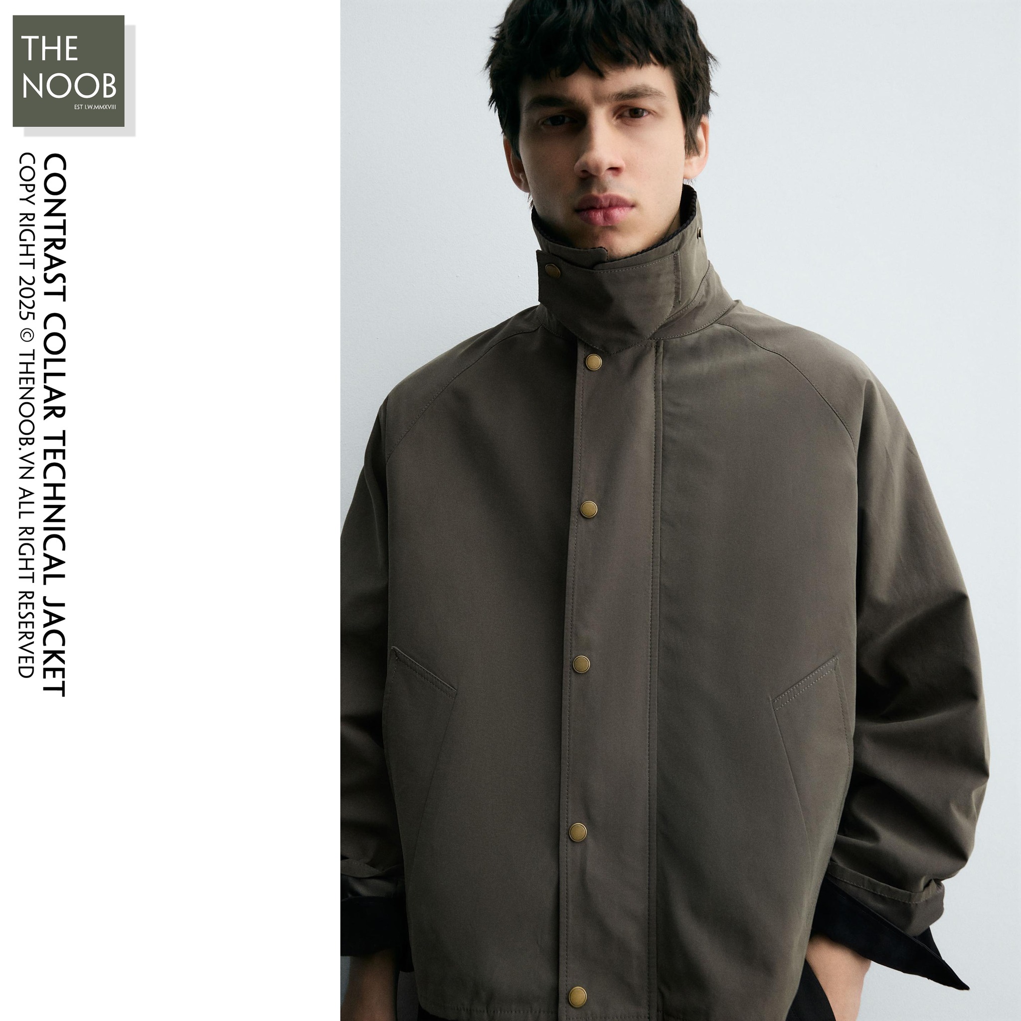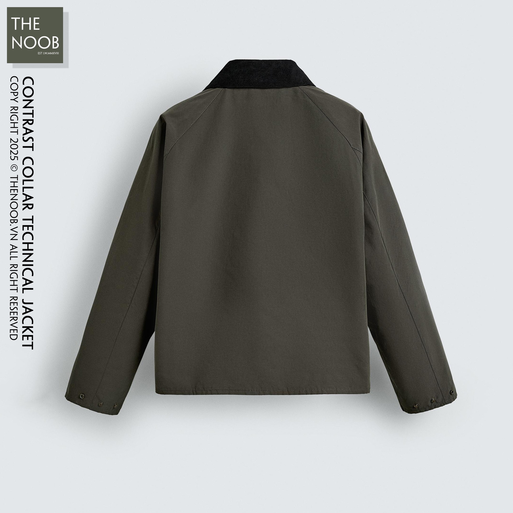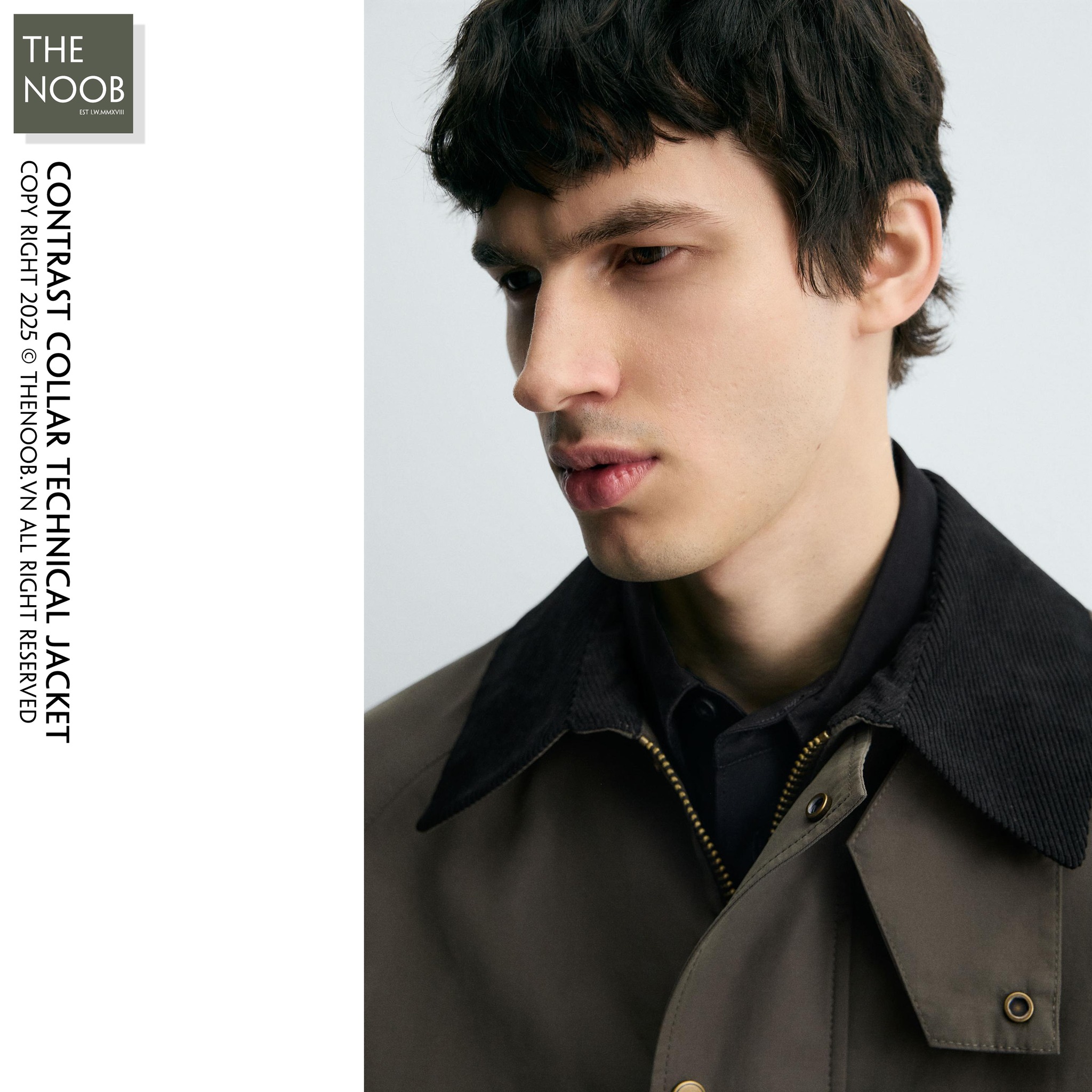 - Cổ áo phối cách điệu với chất liệu vải nhung tăm tone màu đối lập, áo sử dụng cả khóa kéo và khuy bấm để cài