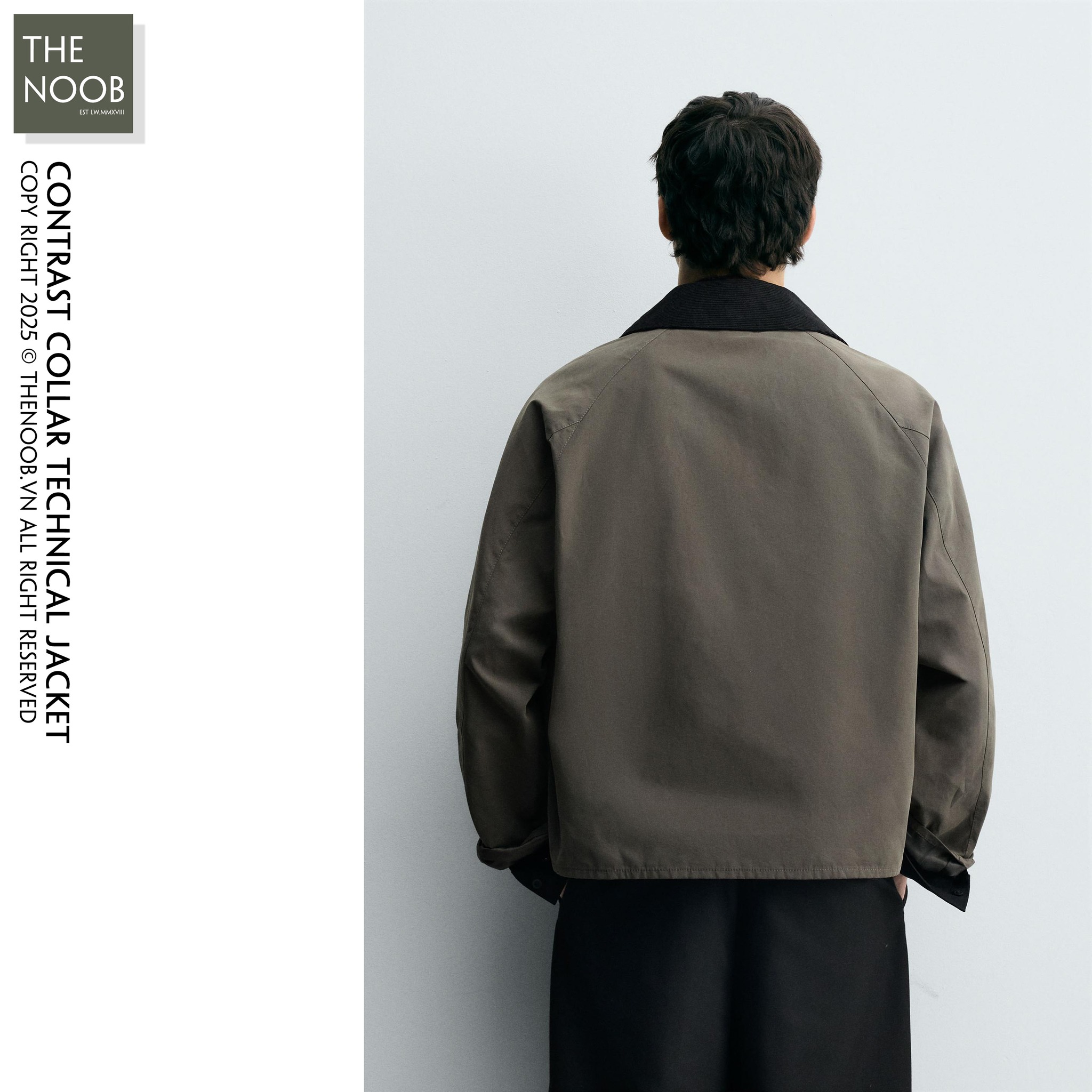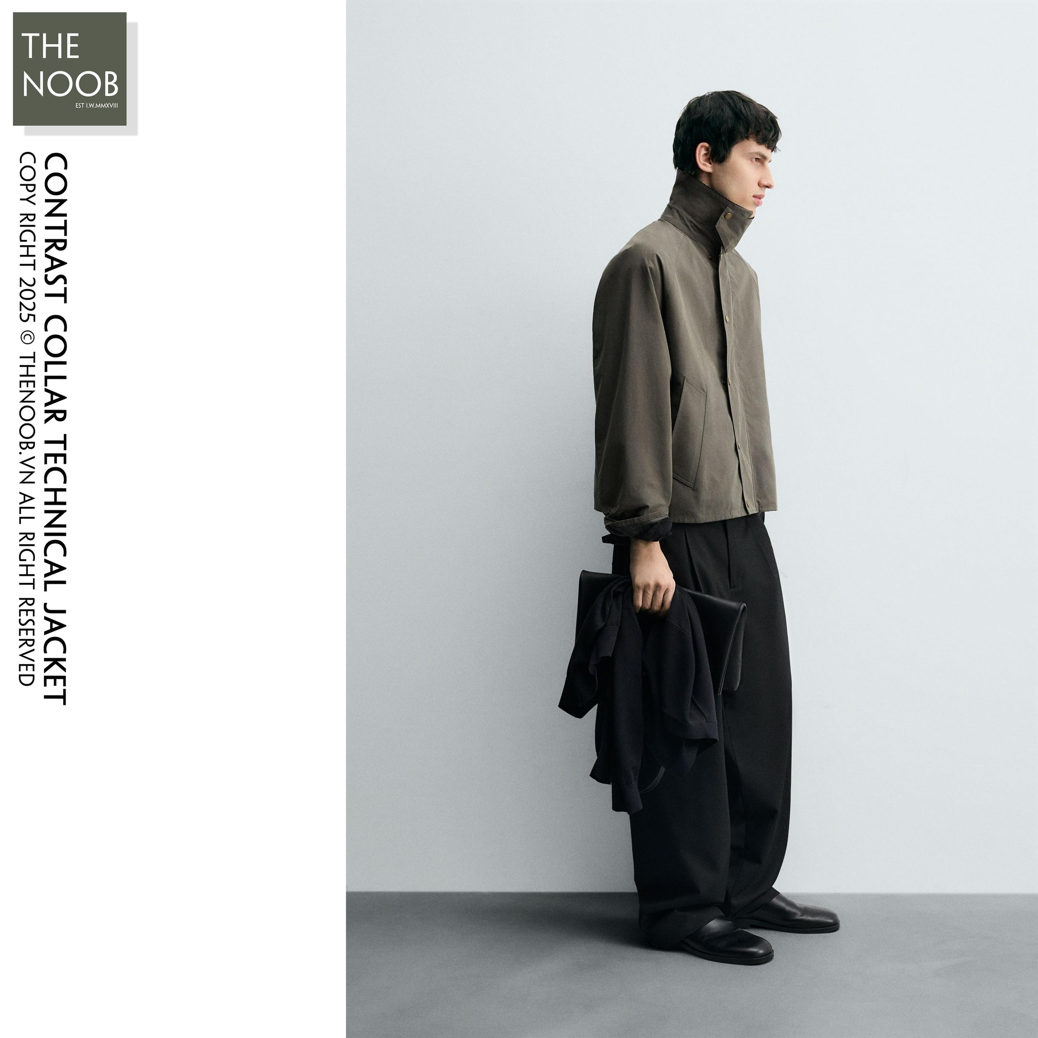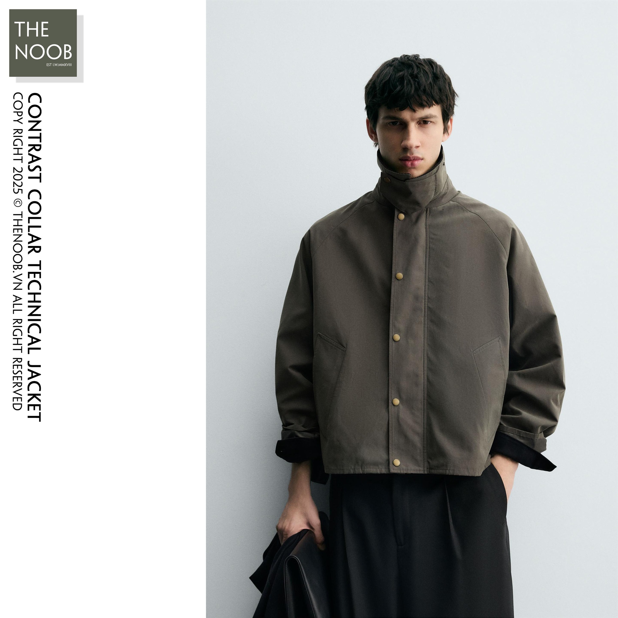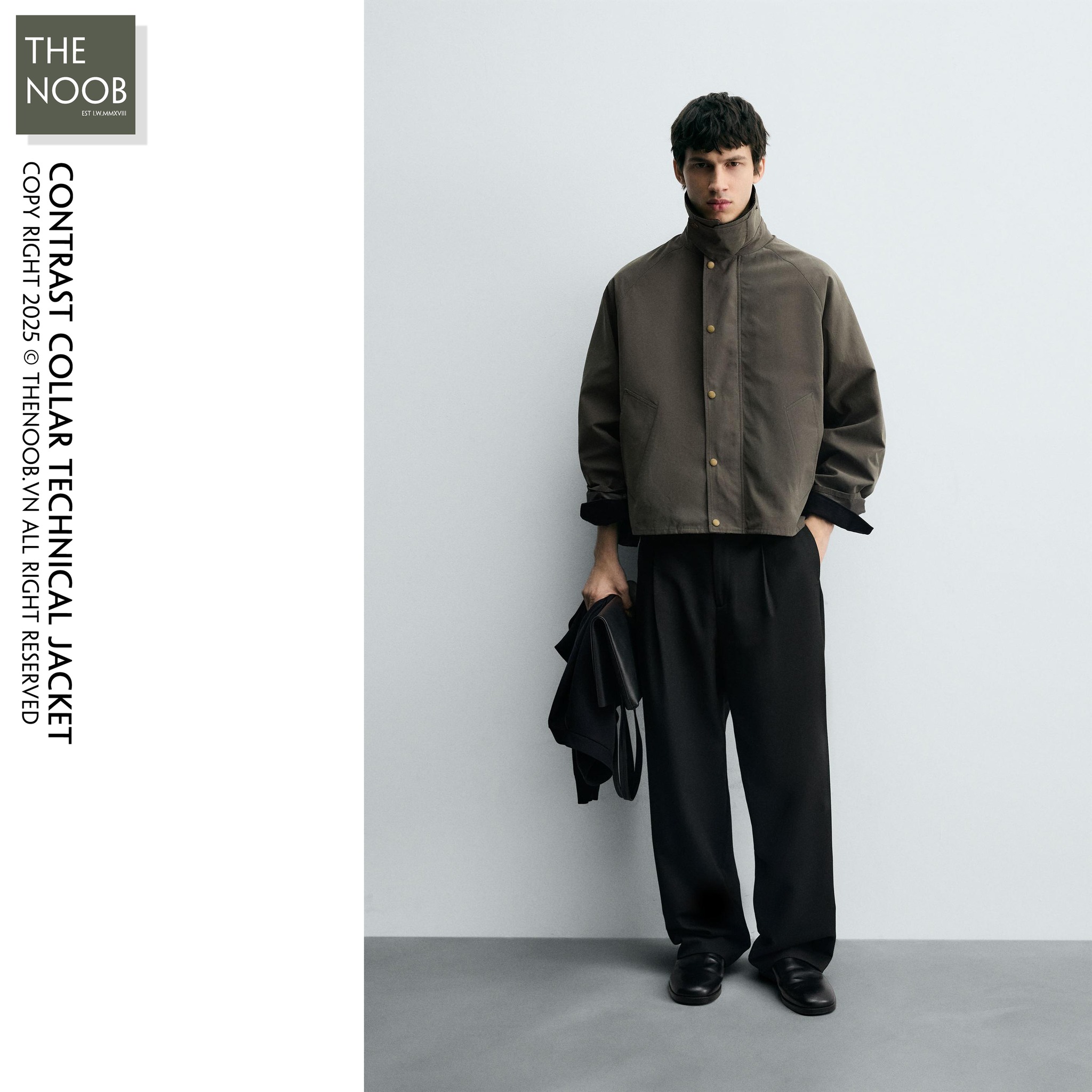 - Cổ áo phối cách điệu với chất liệu vải nhung tăm tone màu đối lập, áo sử dụng cả khóa kéo và khuy bấm để cài