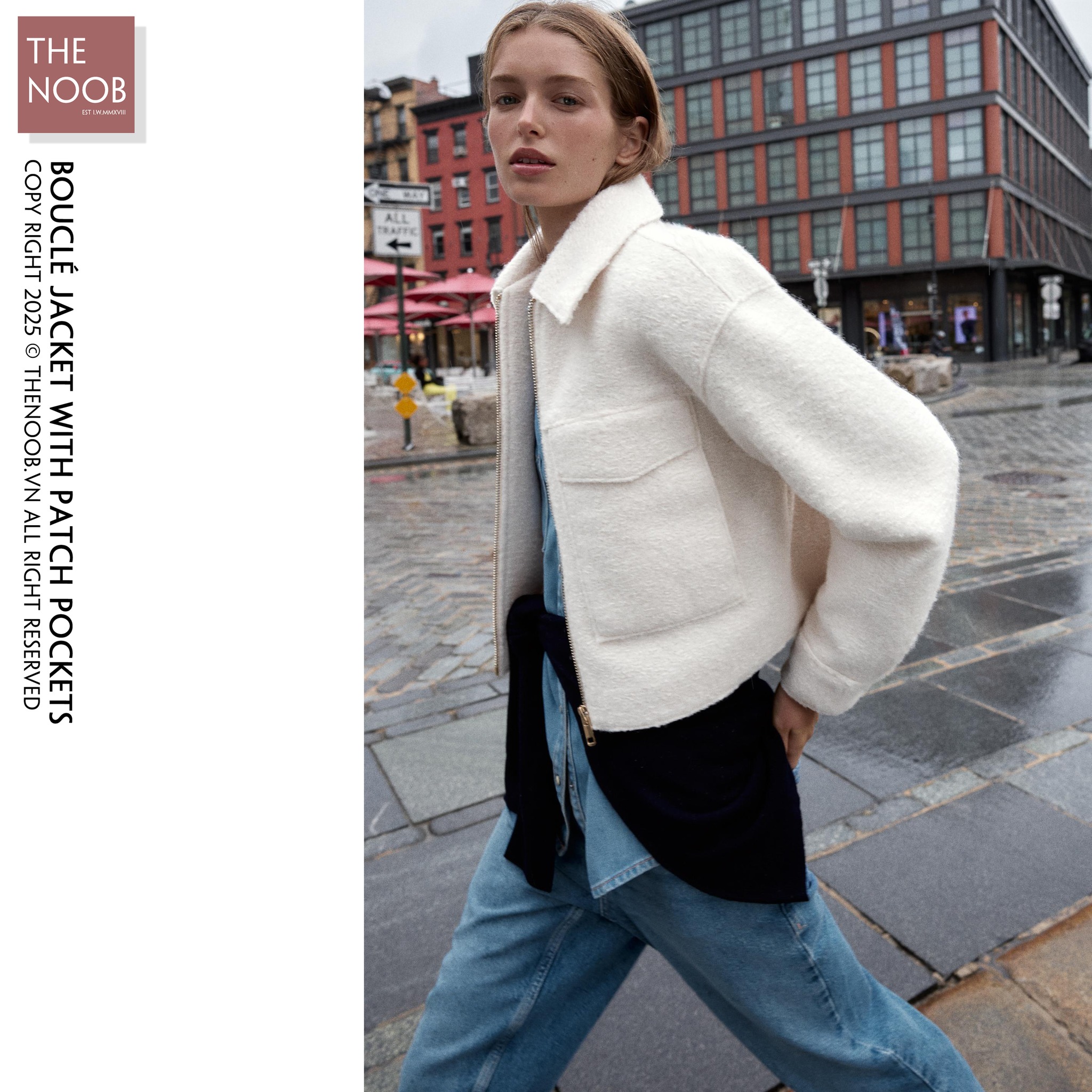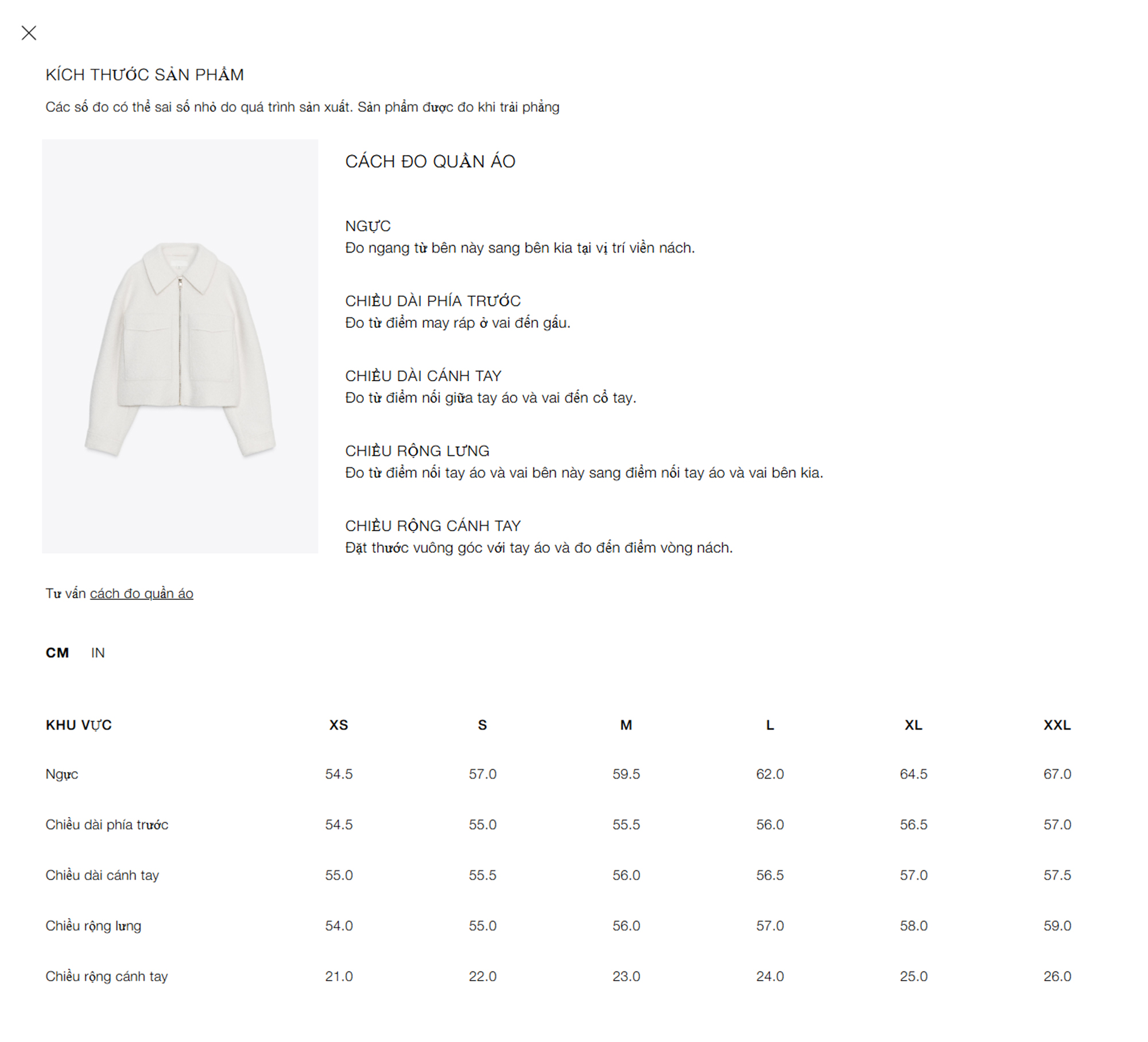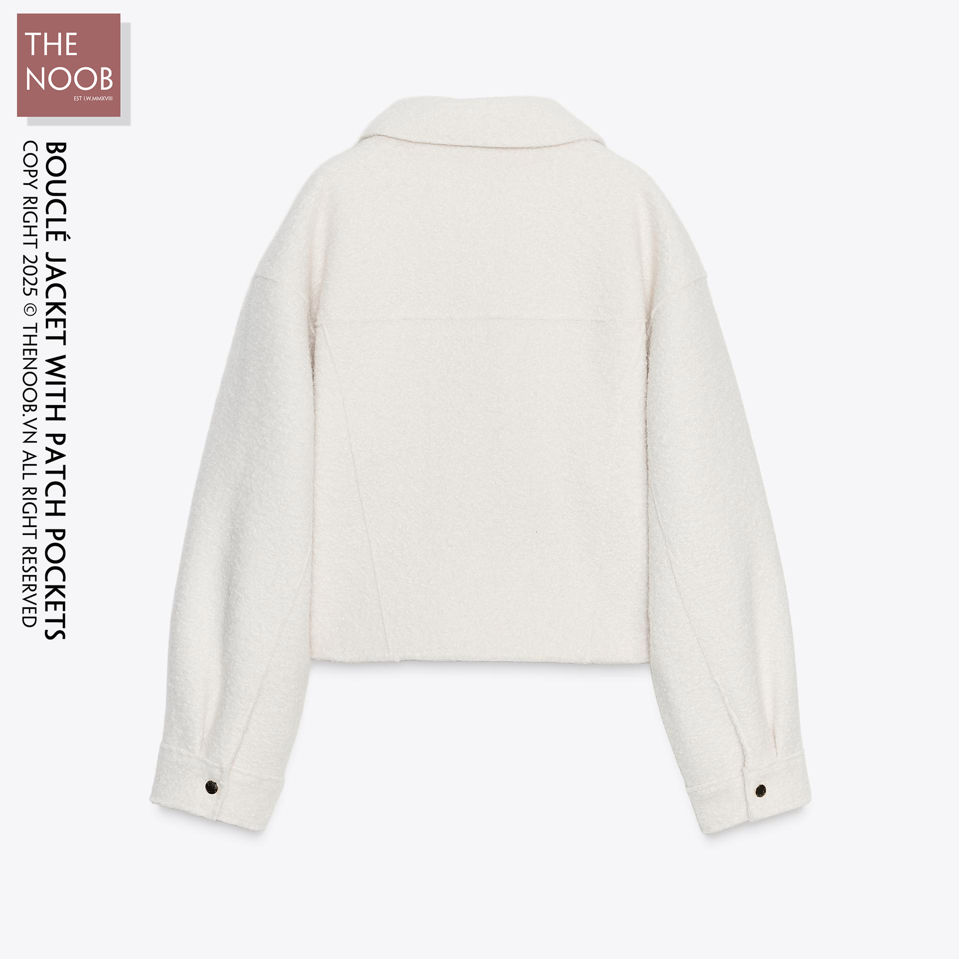 - Dáng áo ngắn, tay dài, form relaxed về bề ngang, sử dụng khóa hợp kim màu vàng bóng trên tone áo màu trắng ngà . Mặt trước phối túi hộp có khuy bấm