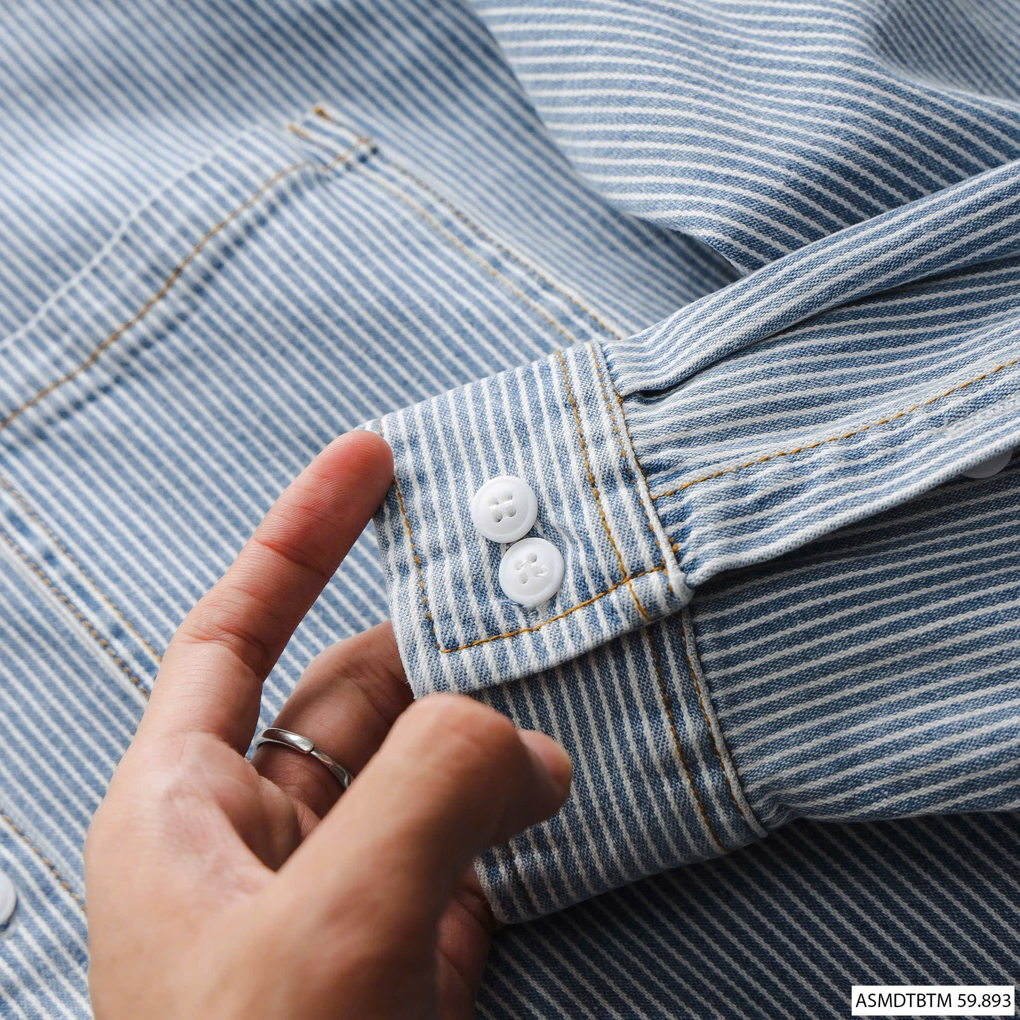 - Áo chất liệu vải denim không co dãn, tỷ lệ dệt 100% từ sợi cotton, họa tiết trên áo là vân sọc dọc nhỏ