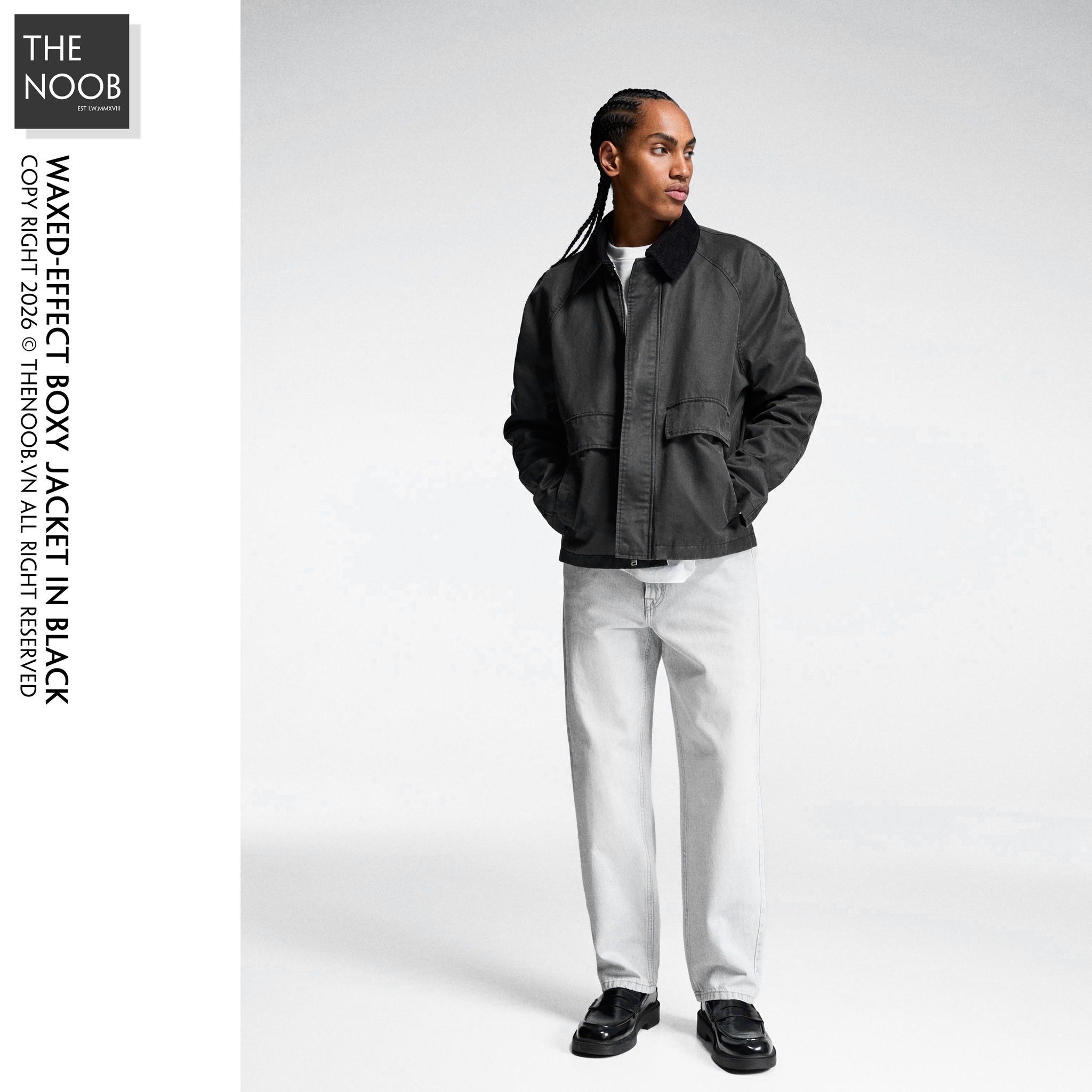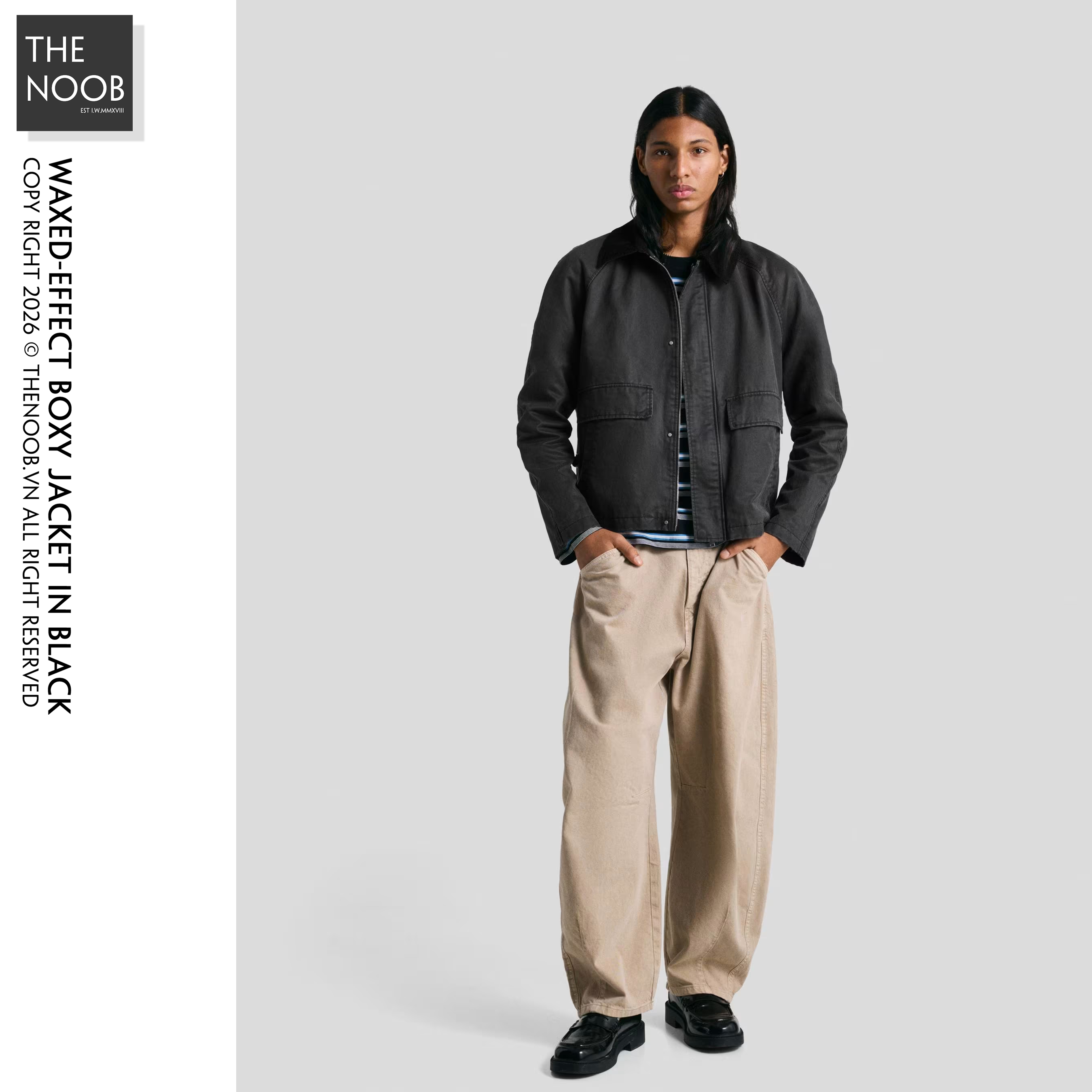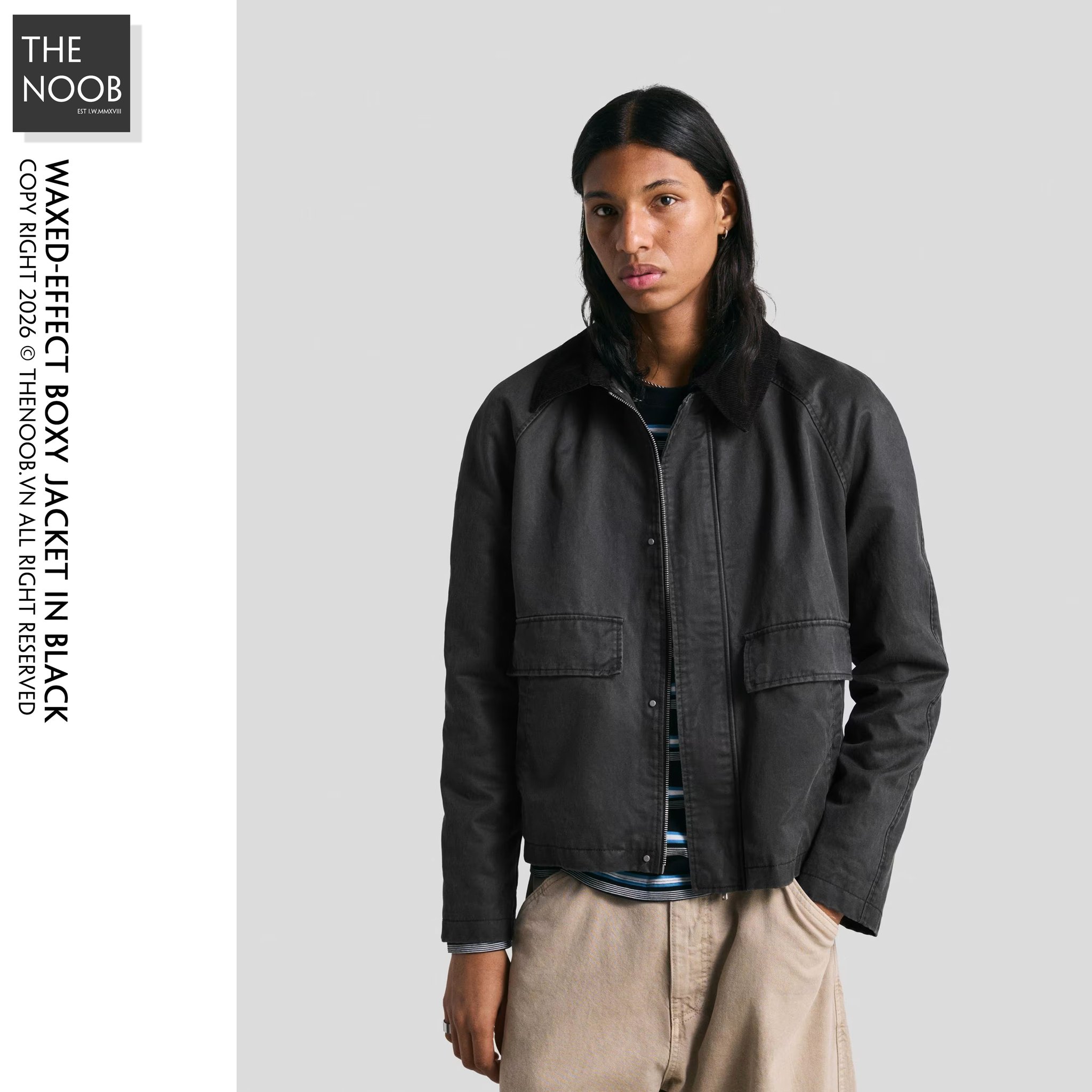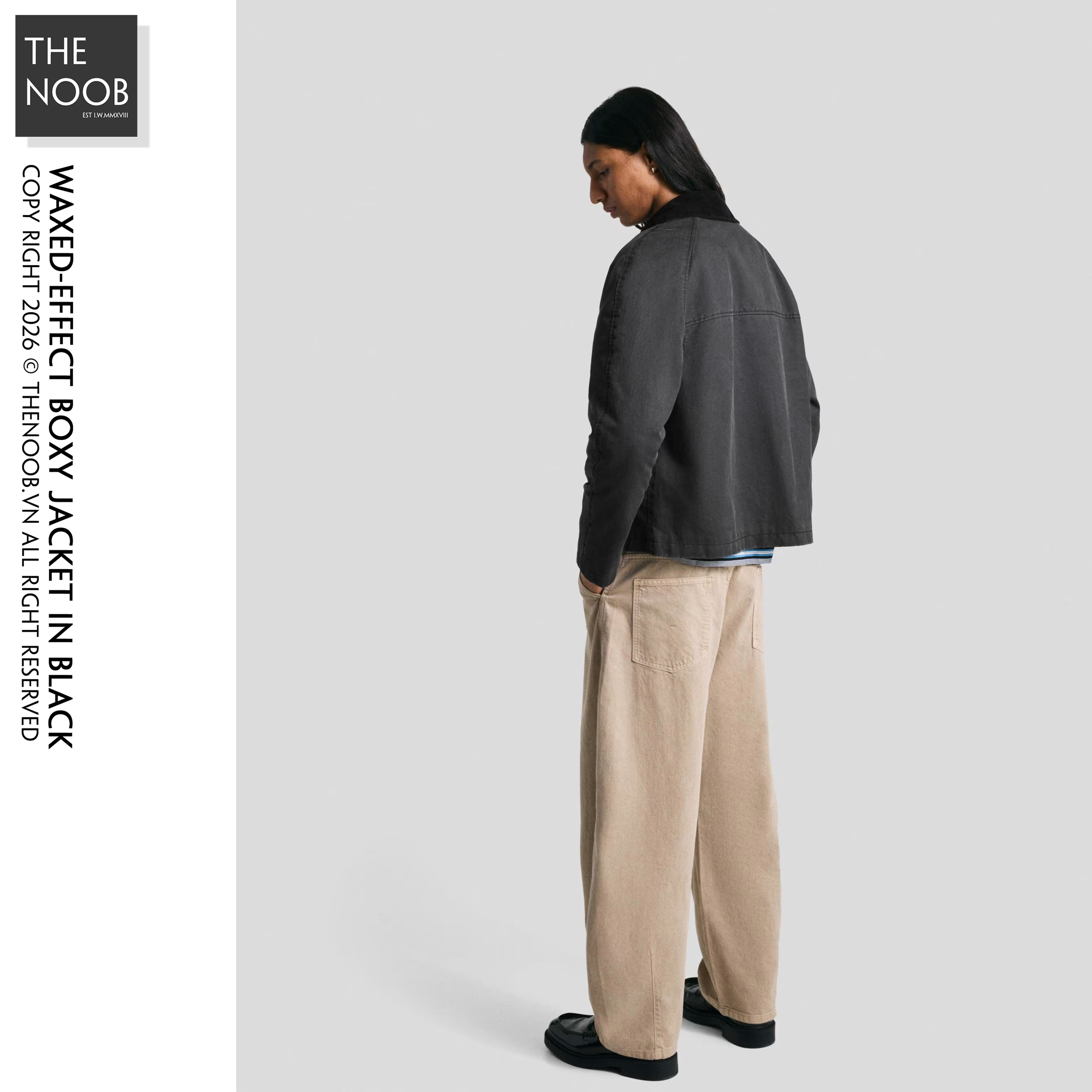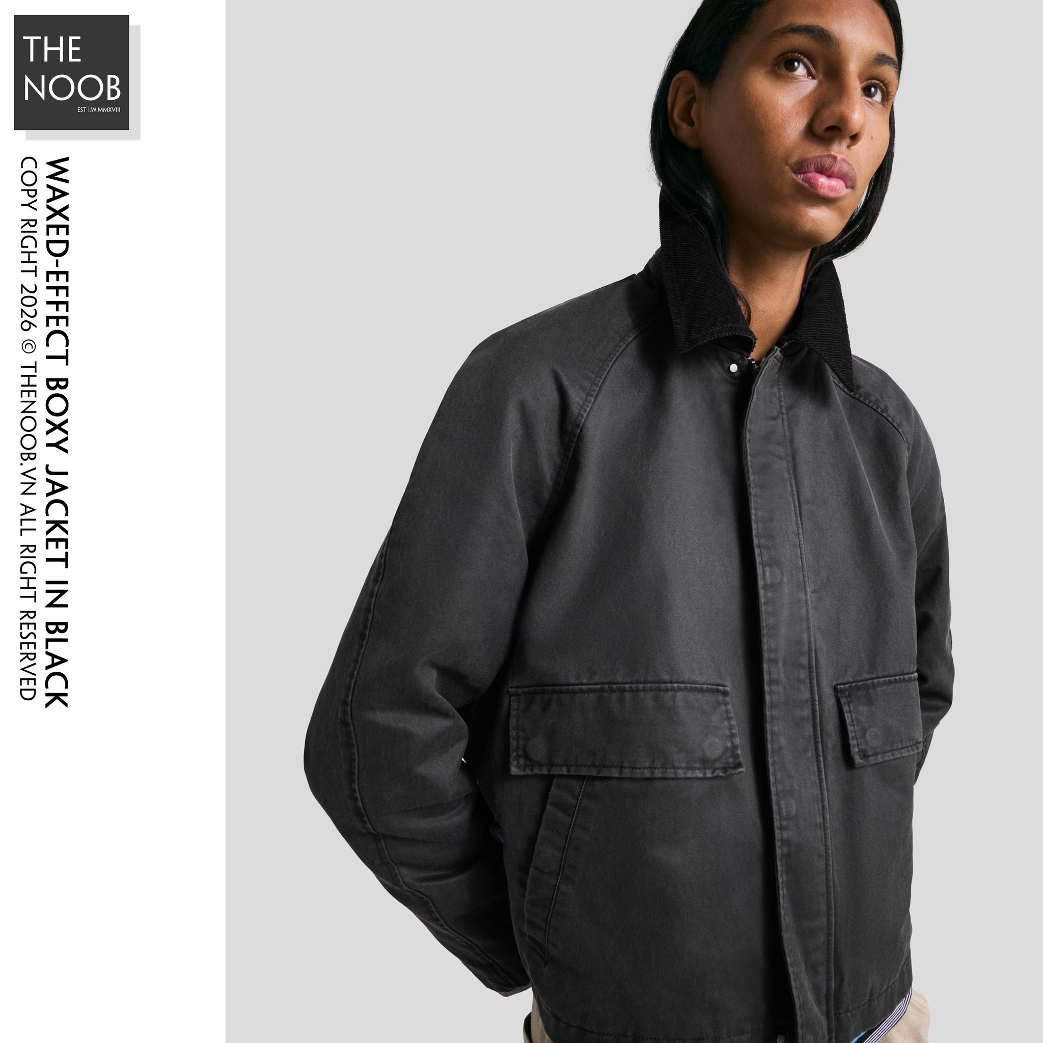 - Áo form ngắn, thân to ngang relaxed, cổ áo phối vải nhung, thiết kế wax bề mặt cho áo có cảm giác giống như được phủ một lớp sáp bóng đặc biệt