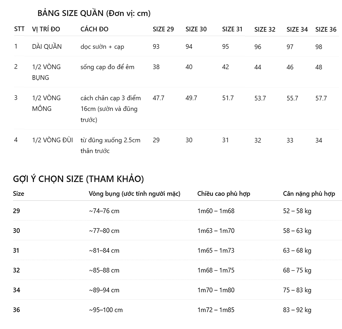 • Body dưới 58kgs mặc size 29 tùy cao tùy phong cách mặc