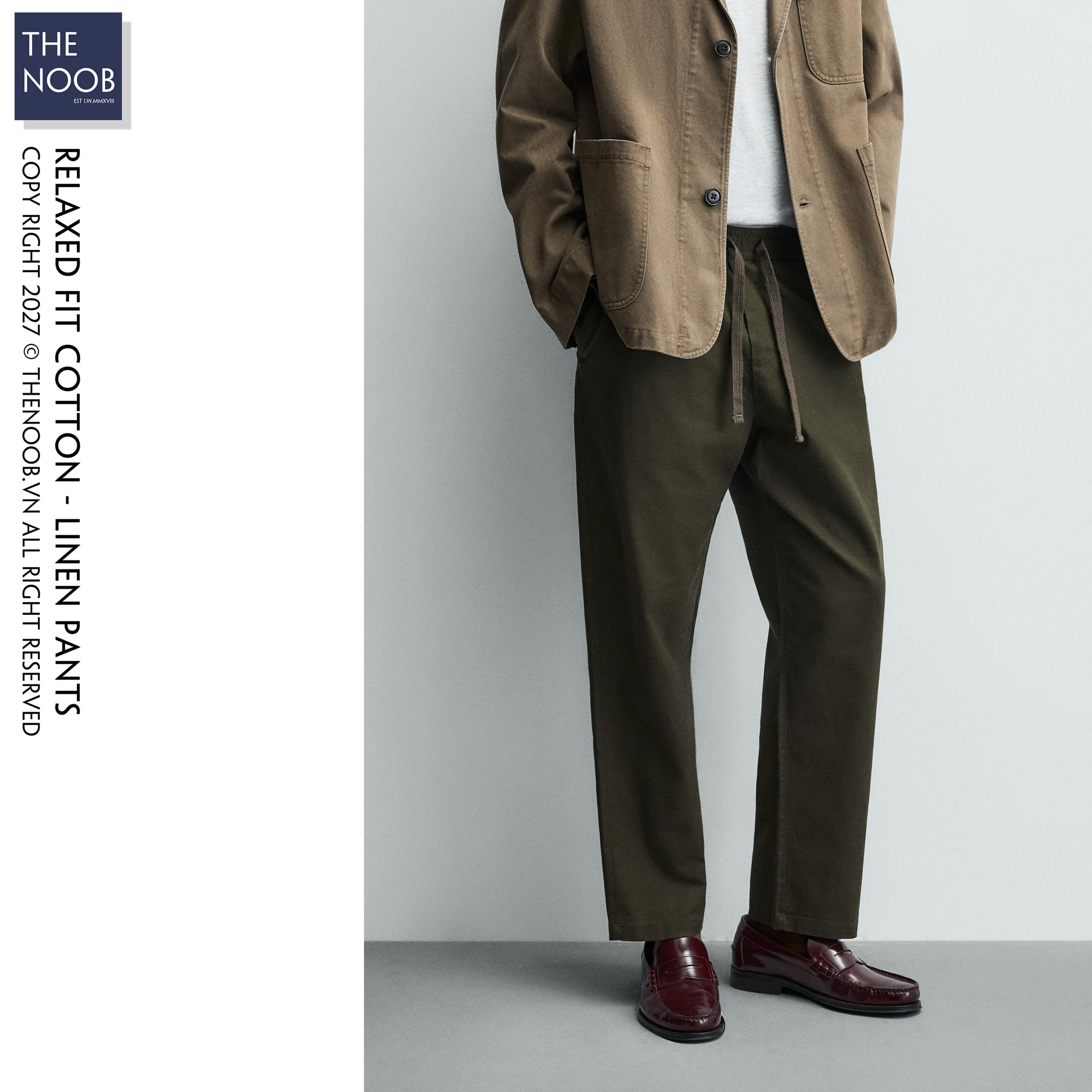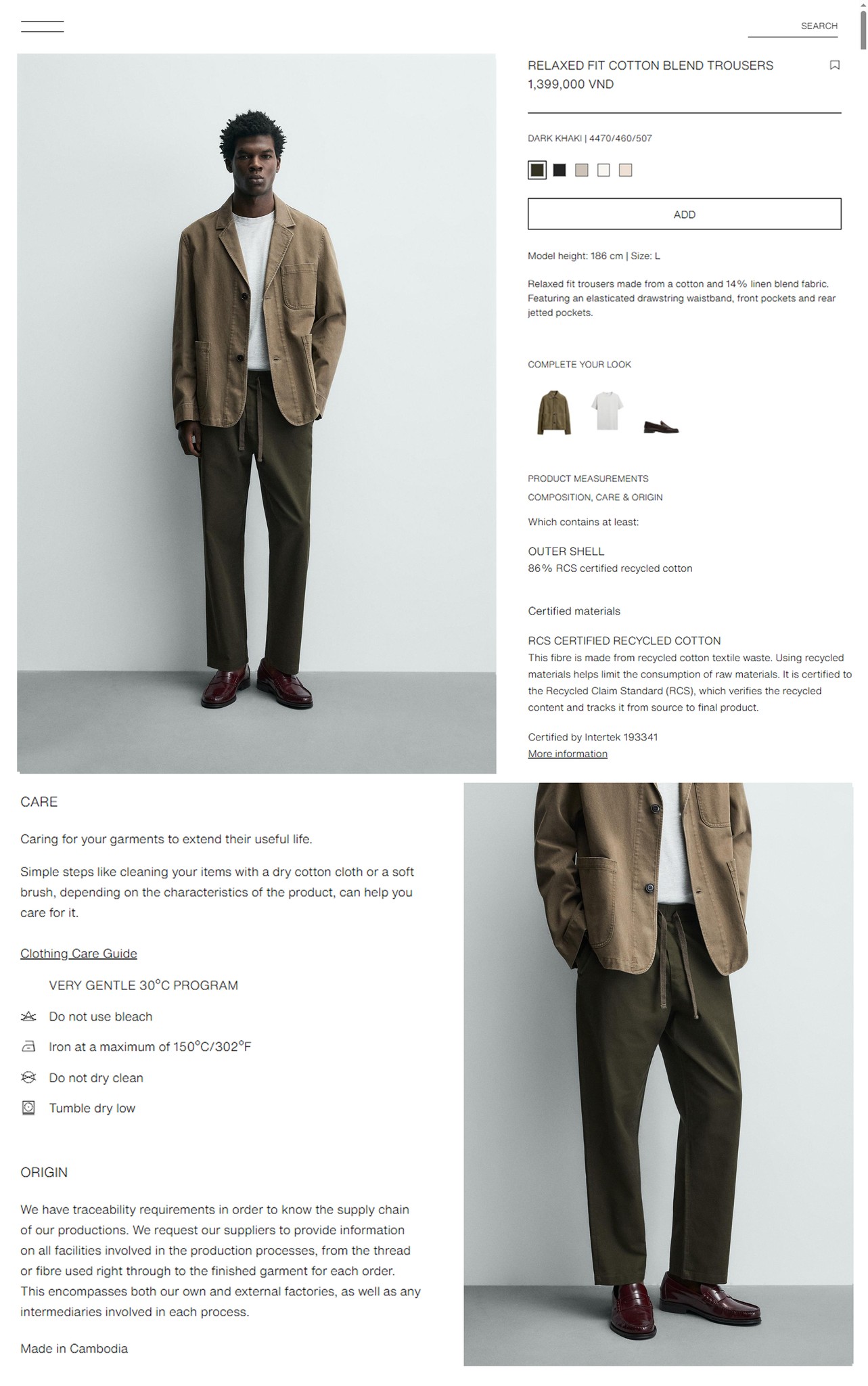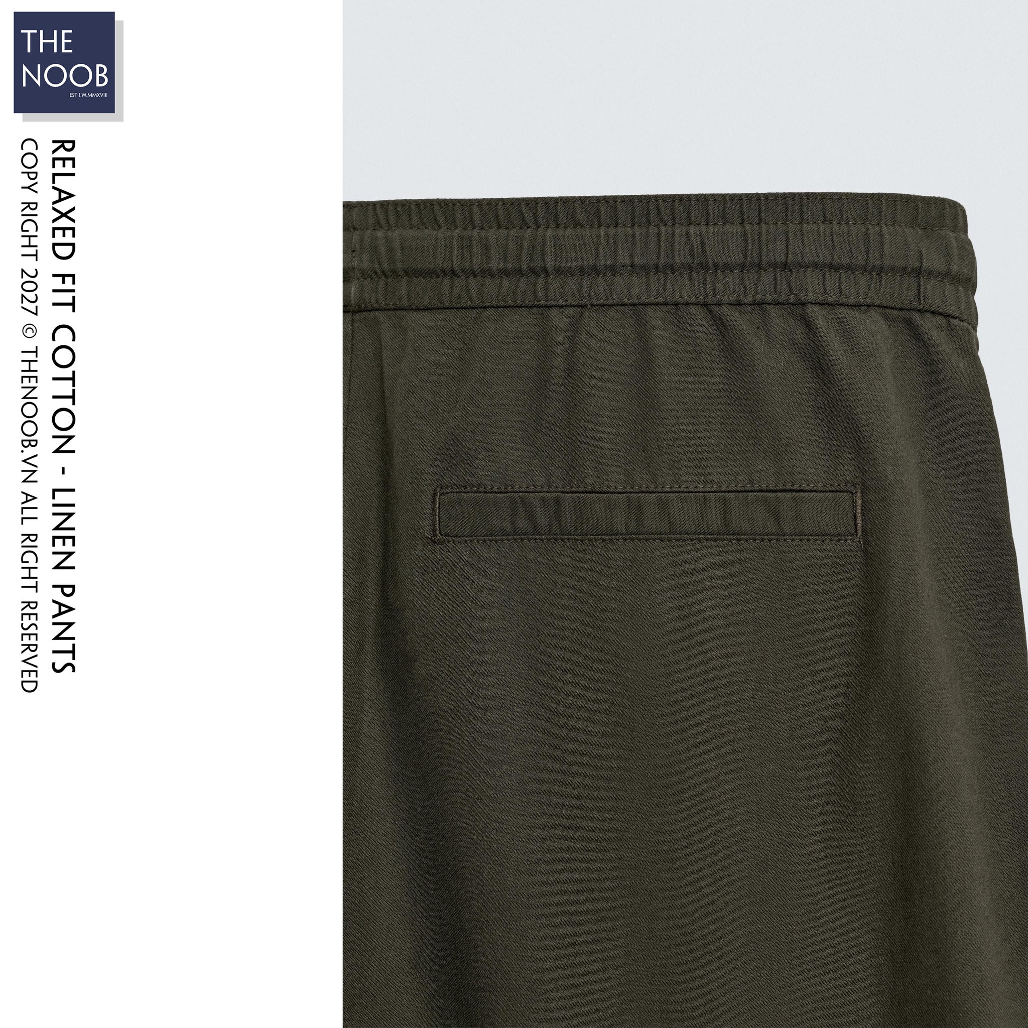 - Quần có thành phần chất liệu dệt từ 86% cotton (RCS) 14% linen, bề mặt vải pha sợi cotton mật độ cao cho quần bền bỉ với tác động ngoại quan, nhưng mang các đặc điểm mềm mại nhẹ nhàng của đũi. Với chất liệu đến từ tự nhiên độ co dãn của quần là không nhiều